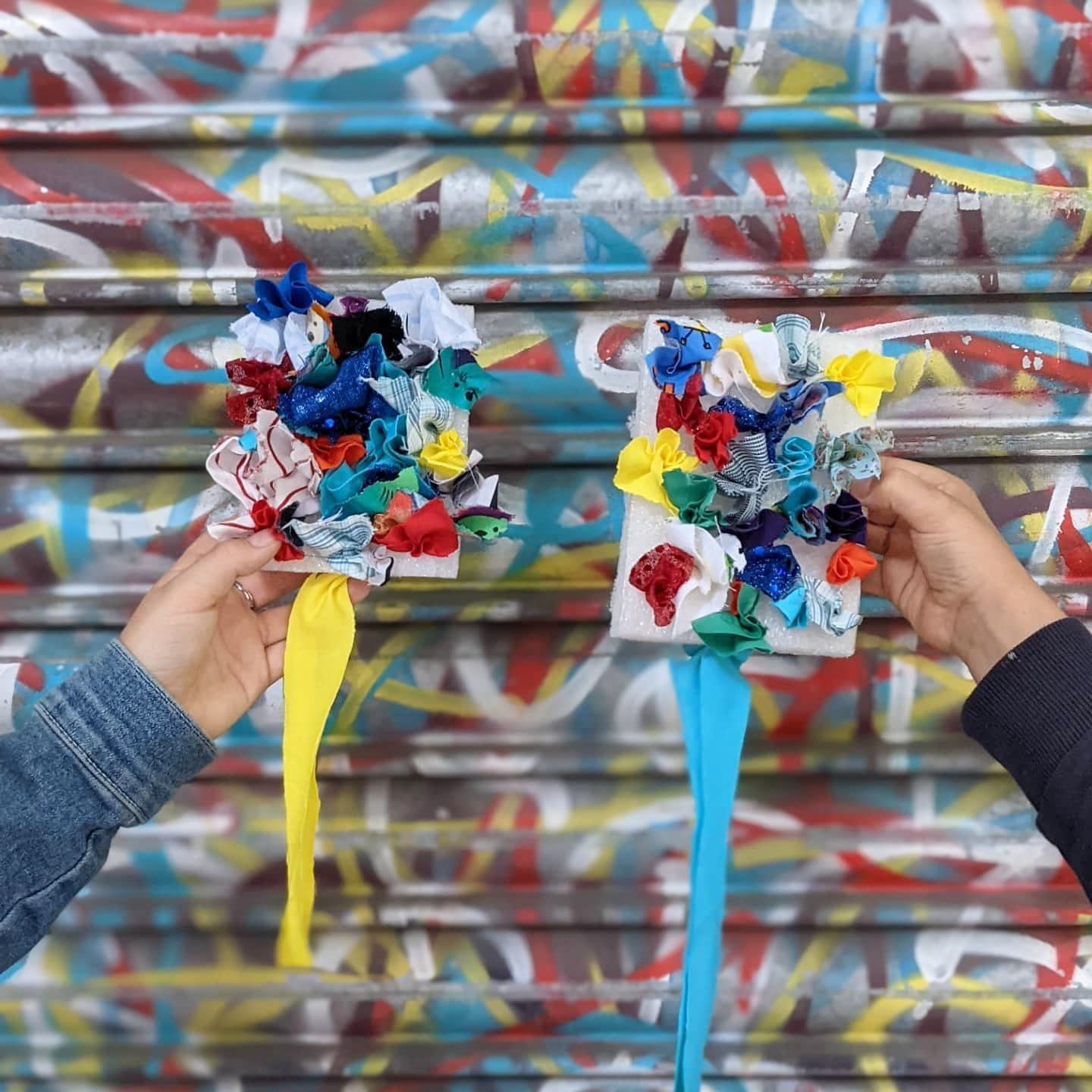 Party decoration workshop for Whitecross Street Party 2020 using reclaimed materials. Play with different textures to improvise playful and vibrants light pieces. The project relies on recycled materials, such as reclaimed fabric or waste paper and foam from discarded packaging.
