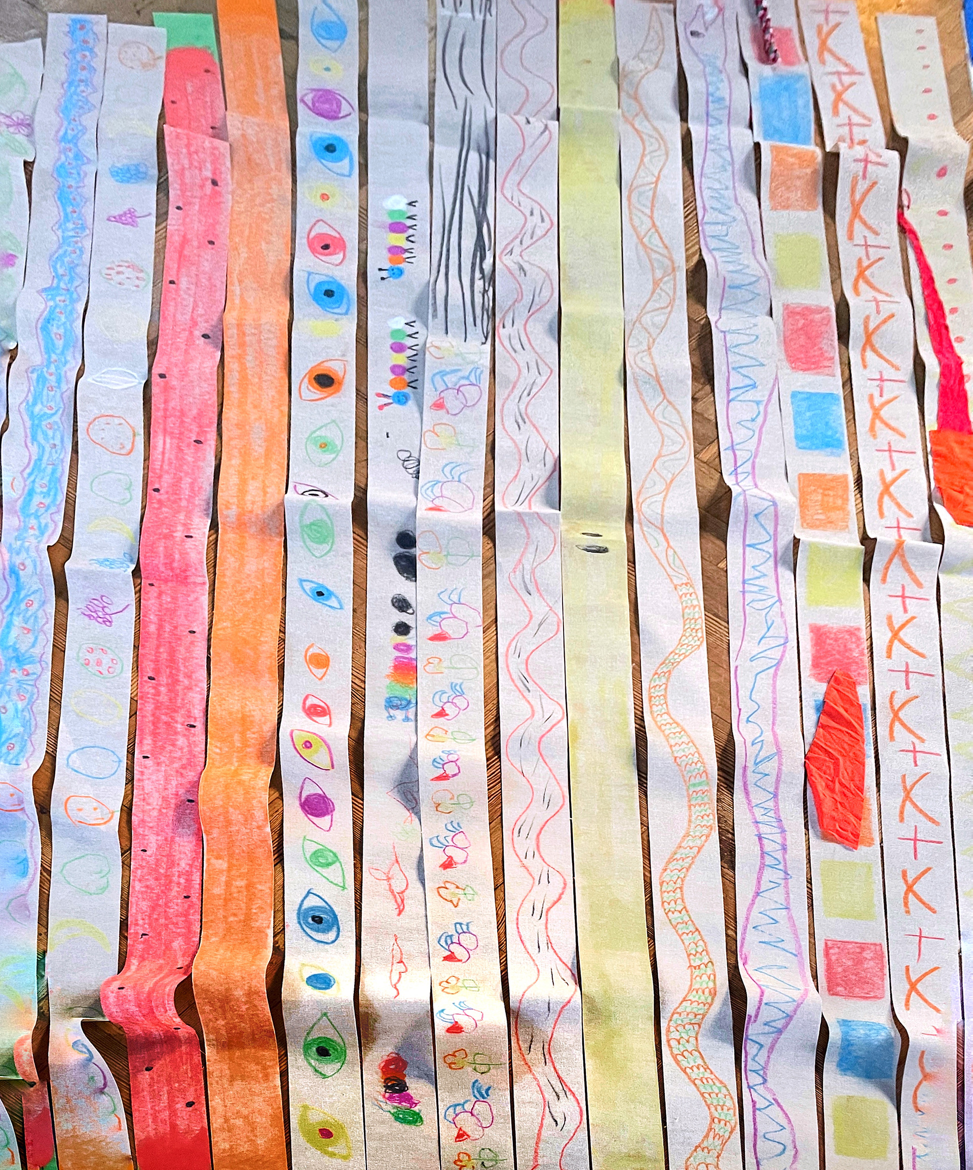 Creative activities for Friday Social Club. at Hargrave Hall. The workshops invite kids and adults to create simple and spontaneous designs using fabric, wool, cardboard, foam and other reclaimed materials as well as exploring other mixed media possibilities.